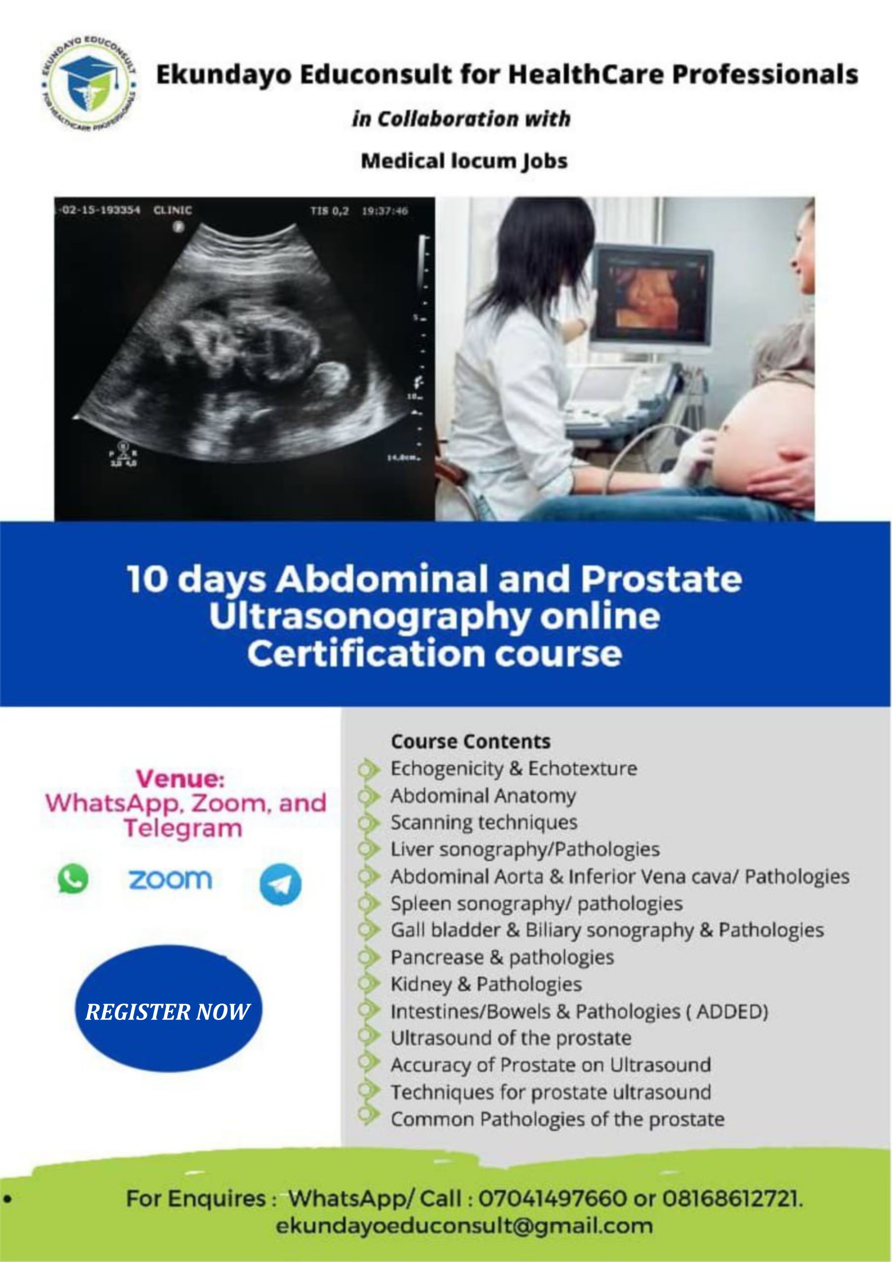 All medical professionals, including Nurses, Midwives, Doctors, Medical lab scientists and Technicians, Anatomists, Physiologist, Physiotherapists, individual students, Pharmacists, and Community health workers, are all welcome to enroll in this course. Radiographers willing to learn about new developments in ultrasonography are also welcome.