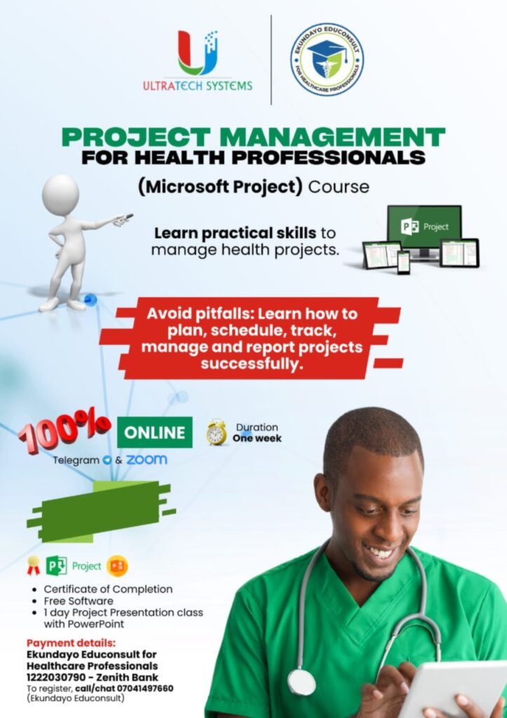 Effective project management is a game-changer in the healthcare industry, improving both patient outcomes and organizational efficiency. Ekundayo Educonsult’s Project Management for Healthcare Professionals course equips you with the essential skills to manage healthcare projects successfully. Whether you are looking to advance your career, improve patient care, or streamline healthcare operations, this course is the perfect step forward in your professional development.